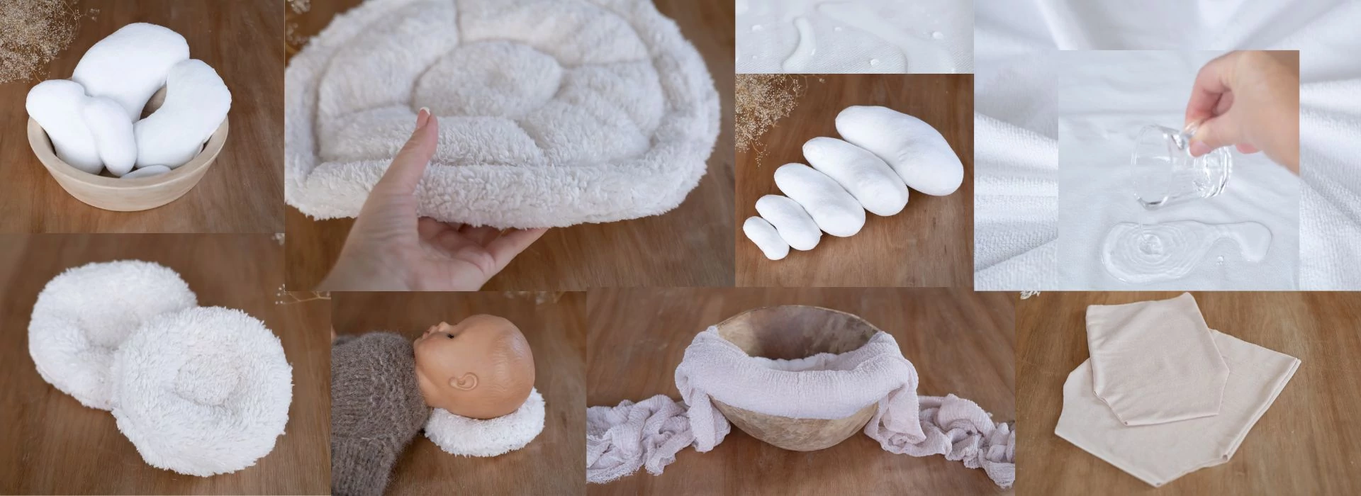 Everything You Need for Newborn Photography. A wide selection of handcrafted newborn photo props in stock: stretch wraps, gauze wraps, newborn headbands, bonnets, beanies, beanbag backdrops, wool layers and blankets. Wooden mini beds and round bowls.