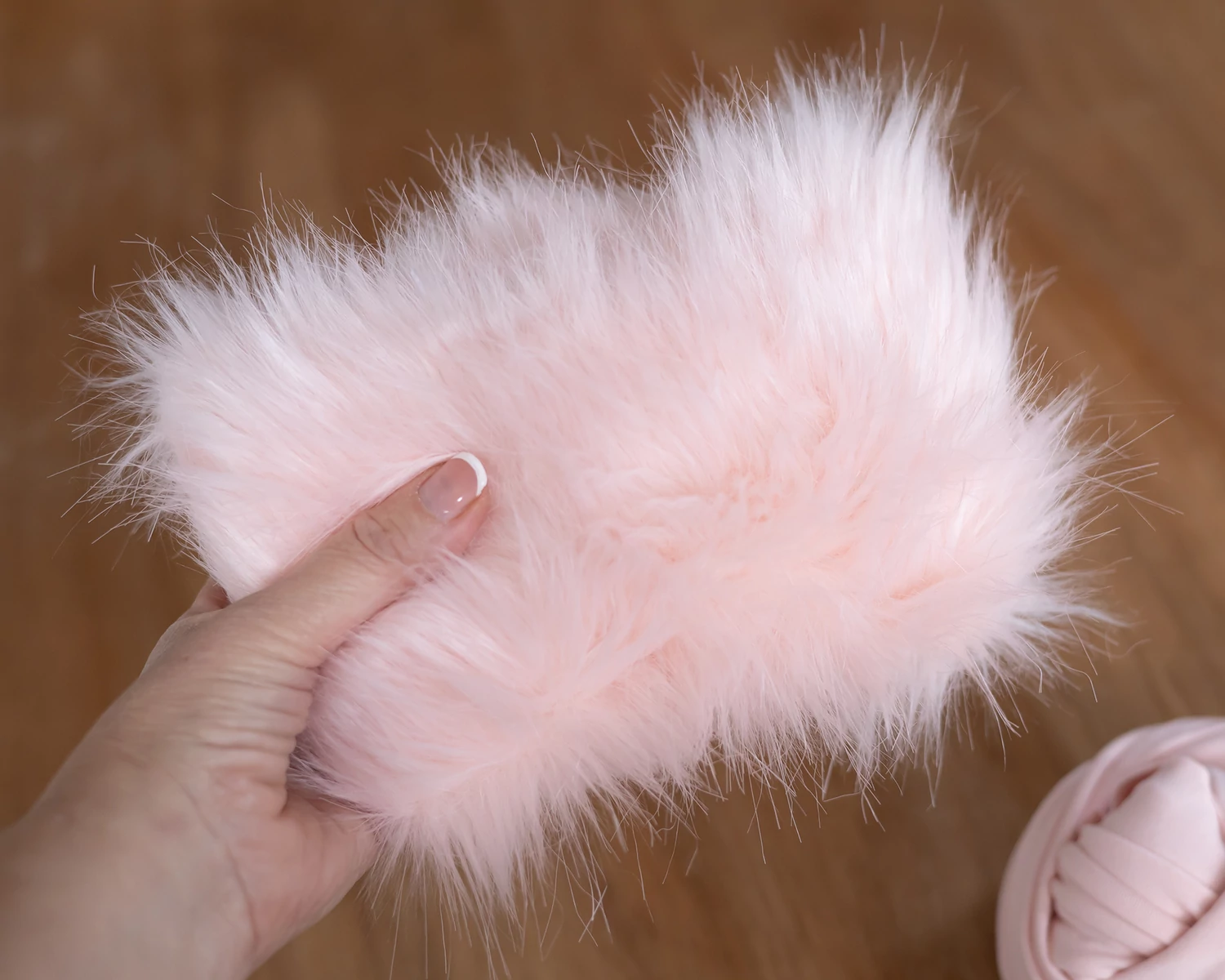 Soft and beautifully matched set for newborn photography, including a blush pink faux fur pillow and a stretchy wrap.