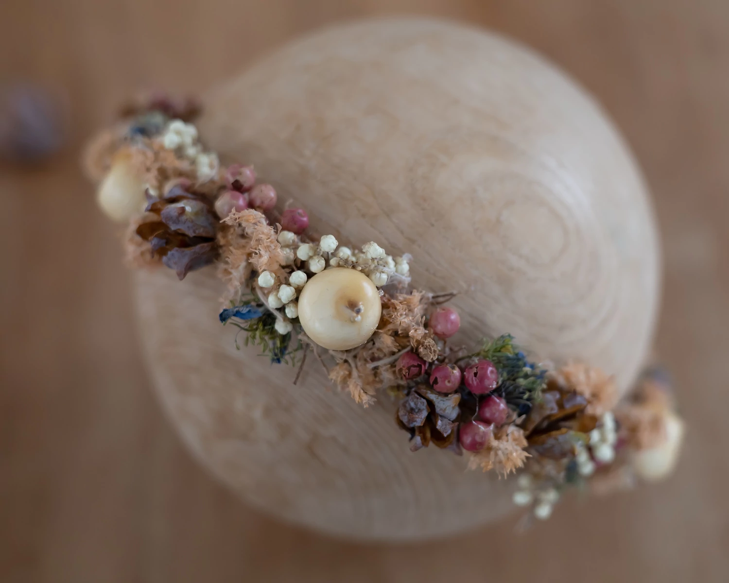 Handcrafted wreath-style headband for newborn photography in warm, autumn-inspired colors. It adds a natural, rustic touch to any photo setup. The headband has an elastic back, making it easy to put on and take off while fitting comfortably on a newborn’s head. Perfect for autumn-themed sessions and natural-style photoshoots.